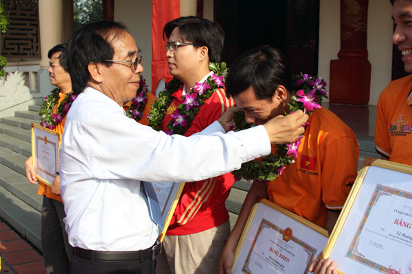 Vice Chairman of the Provincial People’s Committee Nguyen Thanh Tri and Dr. Tran Hanh award certificates of merit to Robocon team’s members.