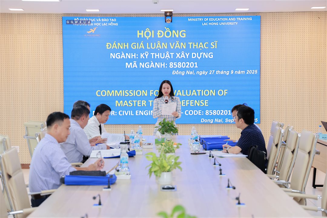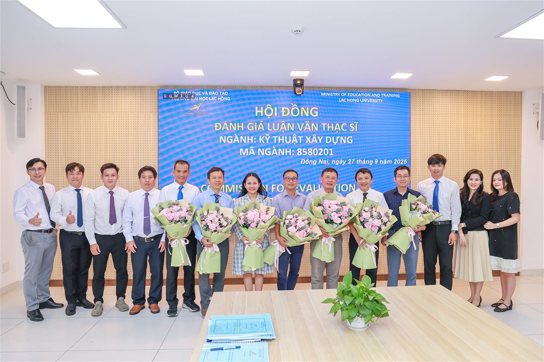 Ngày 27 tháng 9 năm 2025, tại phòng họp cơ sở 1 của Trường Đại học Lạc Hồng, 07 học viên ngành Kỹ thuật xây dựng đã xuất sắc hoàn thành và bảo vệ thành công luận văn thạc sĩ của mình. Buổi bảo vệ diễn ra trong không khí trang trọng và đầy tính học thuật, đánh dấu một bước ngoặt quan trọng trong hành trình học tập và nghiên cứu của các học viên.