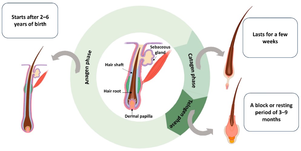 Sự tăng trưởng của tóc không diễn ra liên tục mà theo các chu kỳ lặp đi lặp lại. Theo các tài liệu y khoa, mỗi chu kỳ bao gồm ba giai đoạn chính: