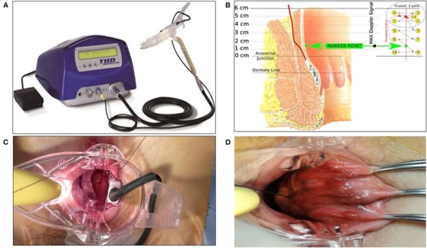 This technique was first performed by Kazumasa Morinaga in 1995. A Doppler ultrasound probe is used to identify six terminal branches of the superior rectal artery, which are then ligated approximately 2 cm above the dentate line. This reduces blood flow to the hemorrhoidal cushions, decreases their volume, and preserves the anal cushions.